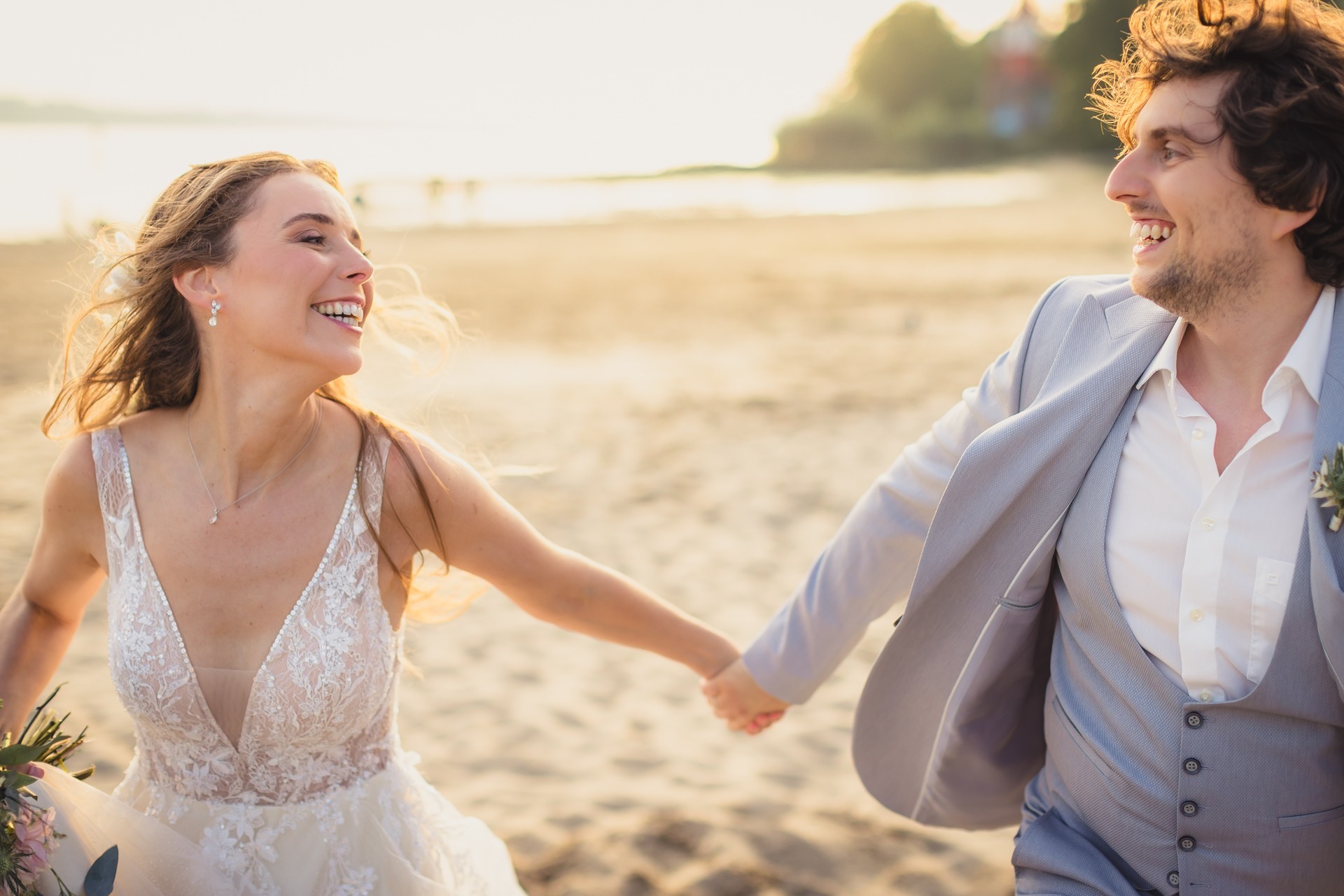 Hochzeit Kiel – Paar lässt am Strand den Korken einer Sektflasche knallen